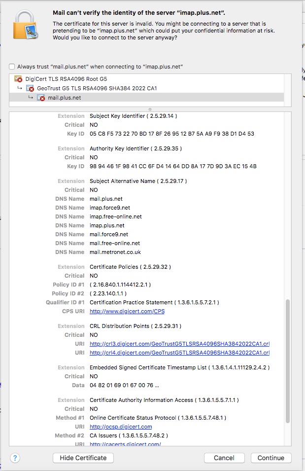 Tried to use my Mac Mail client this morning to be told that "Mail can't verify the identity of the server "imap.plus.net". The certificate for this server is invalid... " etc.