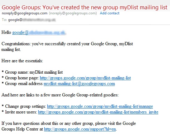 For the purpose of testing, it is really helpful if one of your own email addresses is a member of the Google Group. Prior to terminating your current PN Dlist, you can send emails to the group members by using the Google Group email address as advised in the group creation email – which in our case is mydlist-mailing-list@googlegroups.com. As you might expect, you can use this email address in the TO: address field, however (unlike with the PN list manager) you can also use the email address in the CC: and BCC: fields. Regrettably (unlike with the PN list manager) read and delivery confirmation requests do not appear to work.