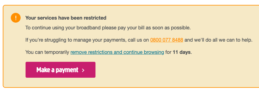 Thanks a lot for your response. This message usually indicates that broadband usage is restricted. I won't be commenting on any billing matters on here due to you having a case hander who's communicating with you via our ticket system on your account but if there's anything else we can help you with, please let us know. ![]()