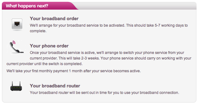 9) What does the current portal home page mean by "first monthly payment" at (7) in this case anyway? As my friends have taken Line Rental Saver, there isn't a regular monthly payment to take for phone. But on the webpage, that sentence is in the "Your phone order" paragraph. But if it meant broadband, then it can't be the "first" because this has already been taken at (2) (or maybe it should be (5)).